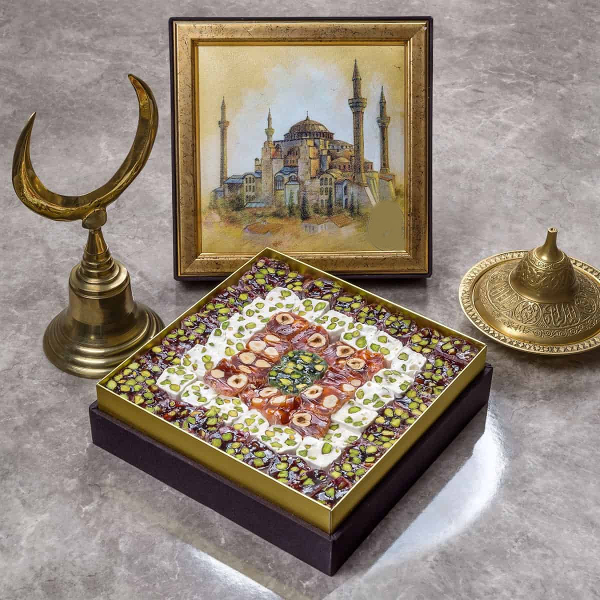 Ingredients: Sugar, corn starch, water, acid regulator(citric acid ), according to the variety (pistachio, hazelnut, walnut, extract of saponariae root),flavourings ( pomegranate, kiwi, honey, coconut, kiwi, orange), colours( paprica extract, anthocyanin, curcumin, copper complex of chlorophylin).